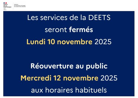 Accueil > Info. générales > Actualités > Fermeture des services de la DEETS lundi 10 novembre 2025
